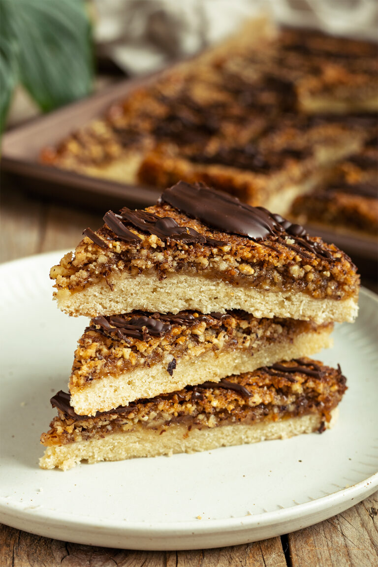 Heute backen wir leckere vegane Nussecken. Nussecken bestehen hier aus einem schönen Mürbeteig, einer Lage Aprikosenmarmelade und einer wunderbar gerösteten Haselnuss-Mandel-Schicht. Abschließend können zwei der drei Ecken in Schokolade getaucht werden. Ich allerdings belasse sie tatsächlich auch gern ohne Schokolade und kredenze meinen Gästen das
