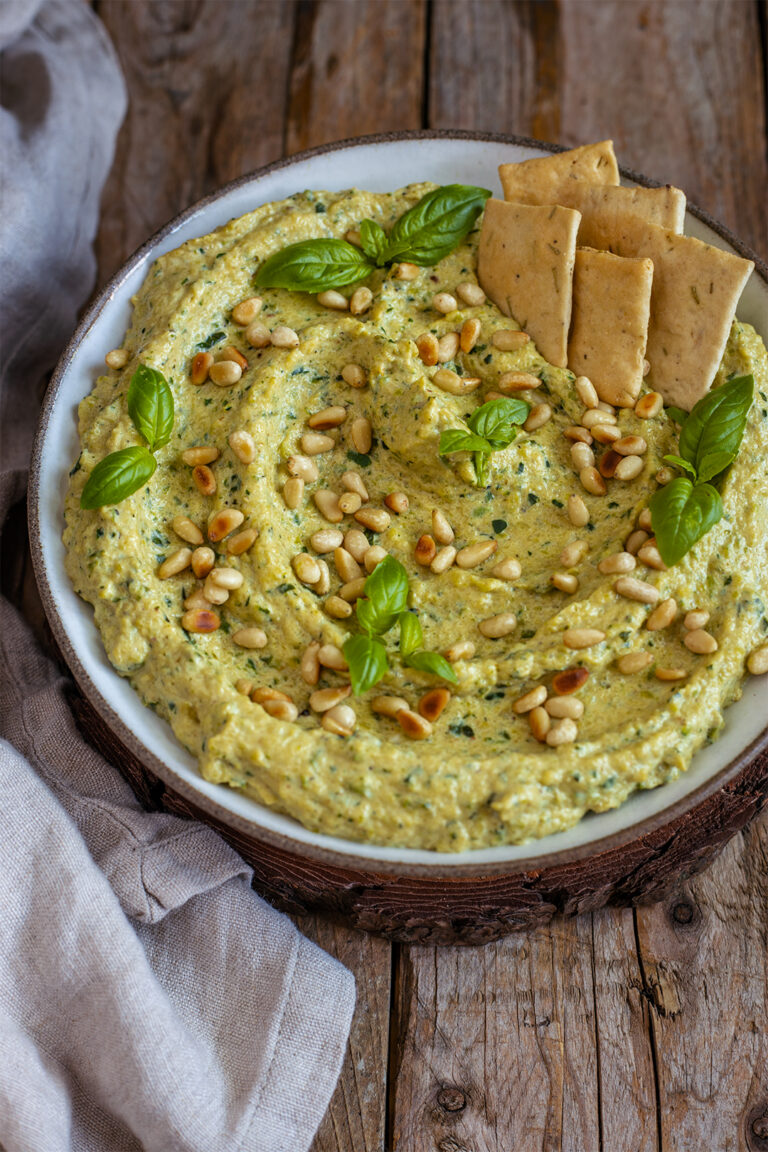 Heute werden wir uns einen herrlichen Dip aus geschmorten Zucchini, Tahin und Joghurt zaubern. Wirklich eine Köstlichkeit, die ihr euch mit ordentlich Gemüsesticks und knusprigen Crackern auf dem Sofa gönnen könnt. Selbstverständlich ist dieser vegane Dip auch herrlich zu z.B. Ofengemüse oder auf einer leckeren