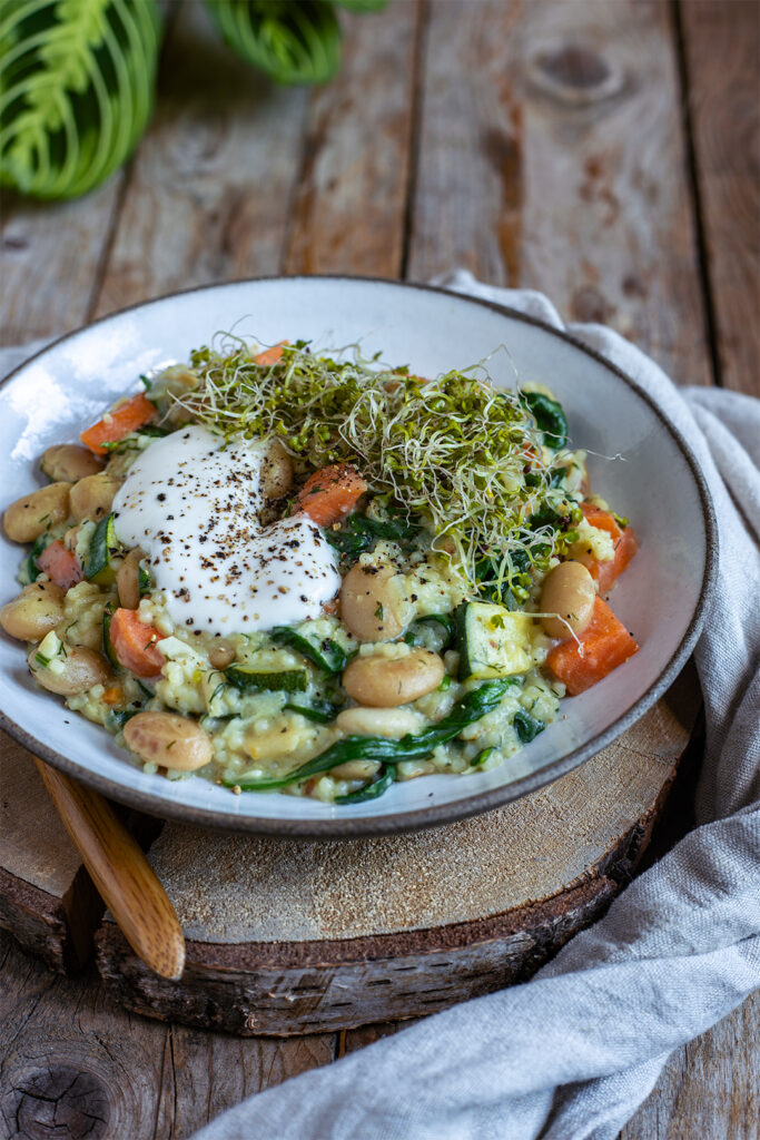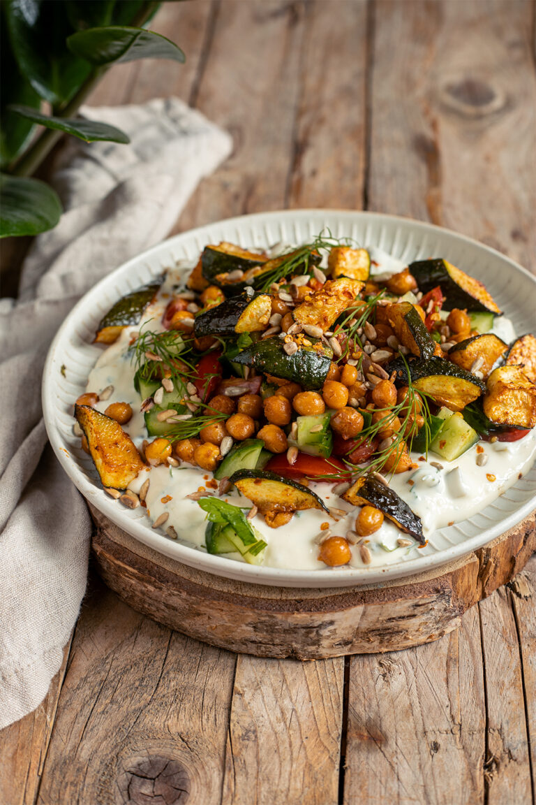 Die Kombination aus warm und kalt holt mich einfach immer ab und deswegen machen wir heute einen leckeren Salat mit Ofengemüse, auf einem Bett aus Gewürzgürkchenquark. Wir bauen unser heutiges Gericht in drei Schichten der Köstlichkeit auf und versorgen uns mit 1. ordentlich pflanzlichem Protein