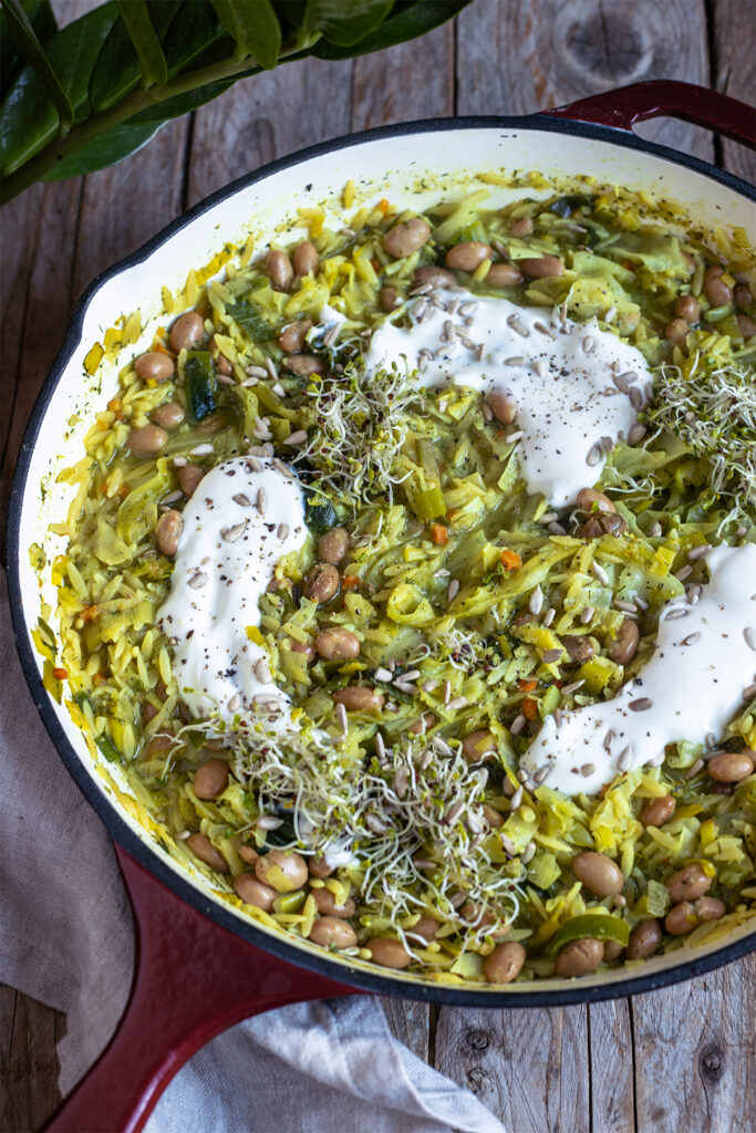 Alle meine Gewürzgurken-FreundInnen, jetzt mal aufgepasst… Wir machen heute veganen Schmorgurkeneintopf oder besser, eine Schmorgurkenpfanne und das ist einfach nur göttlich lecker! Die Schmorgurke, wer sie noch nicht kennt, ist eine saisonale Freilandgurke, die in den Sommermonaten Juli bis September Saison hat. Sie ist meist