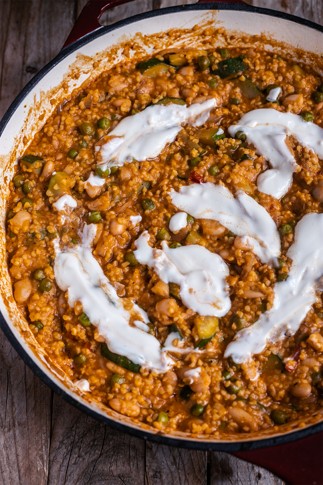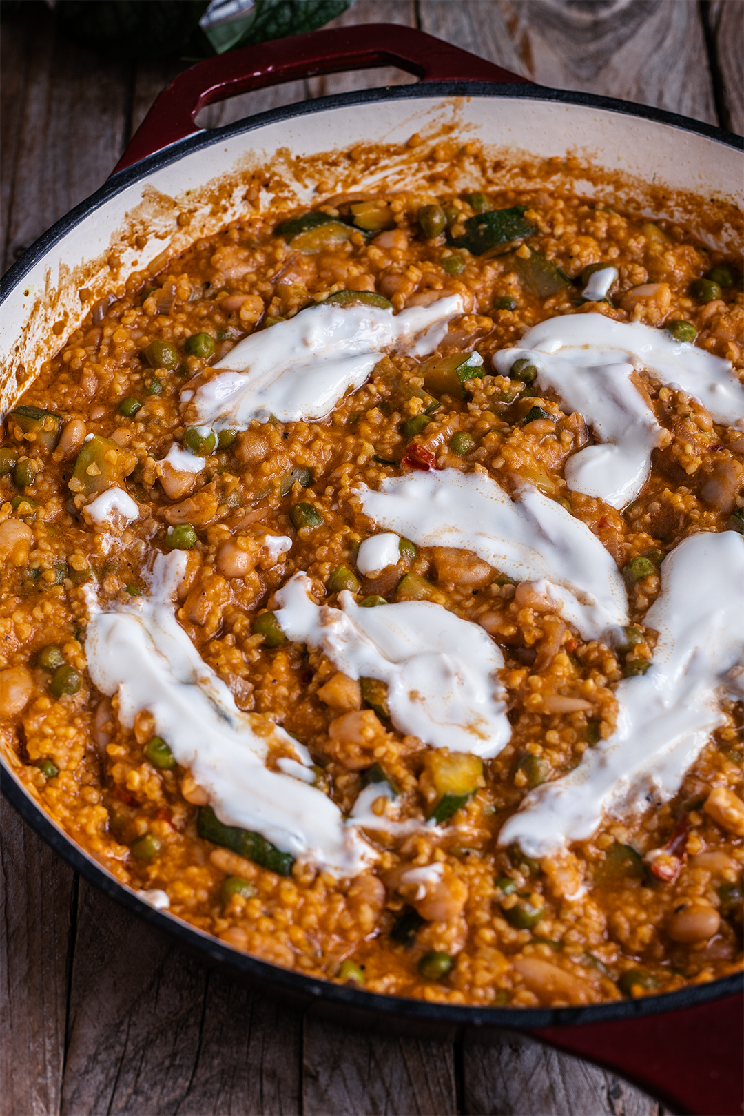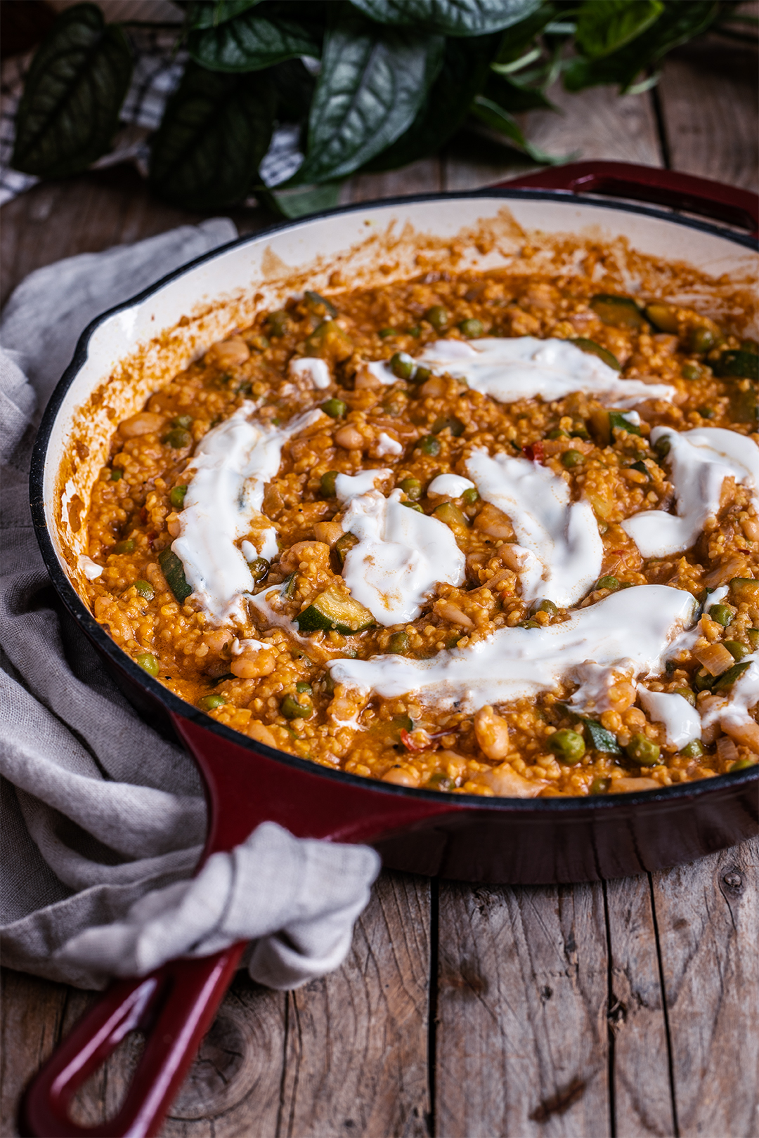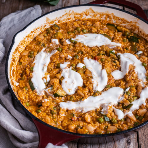 - Jetzt nochmal sicherstellen, dass wirklich alles gar ist, ggf. nochmal abschmecken und dann wird in der Pfanne oder in tiefen Tellern mit etwas veganem Joghurt angerichtet.