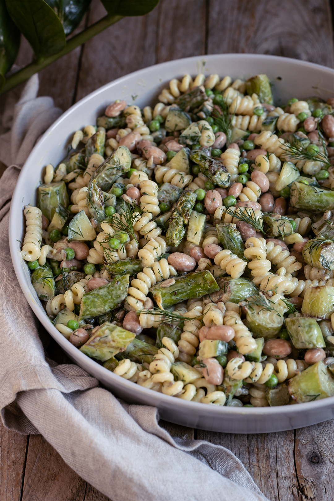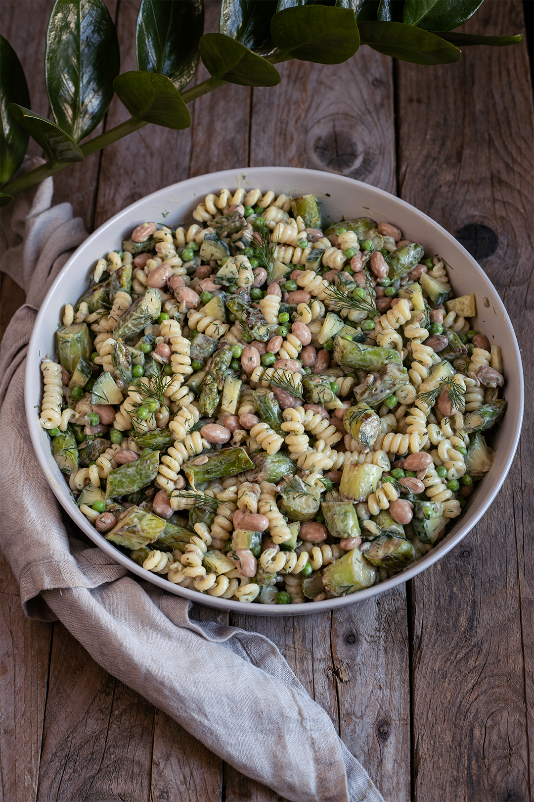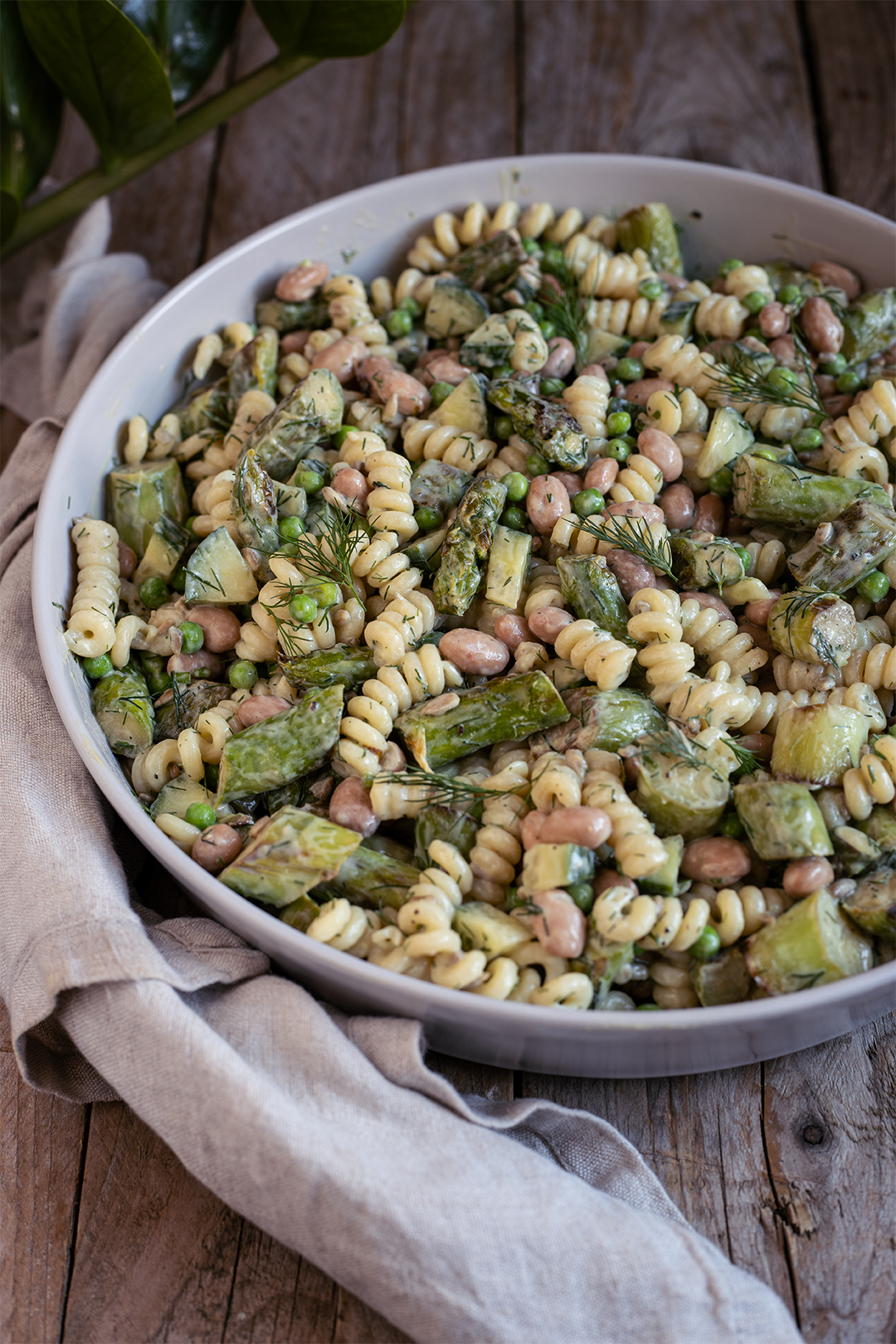 - Die abgegossenen Nudeln und Erbsen sowie der gebratene Spargel plus die abgegossenen und gewaschenen Borlotti Bohnen, Gurken, Dill, geröstete Sonnenblumenkerne und die Hefeflocken kommen nun auf das Dressing.