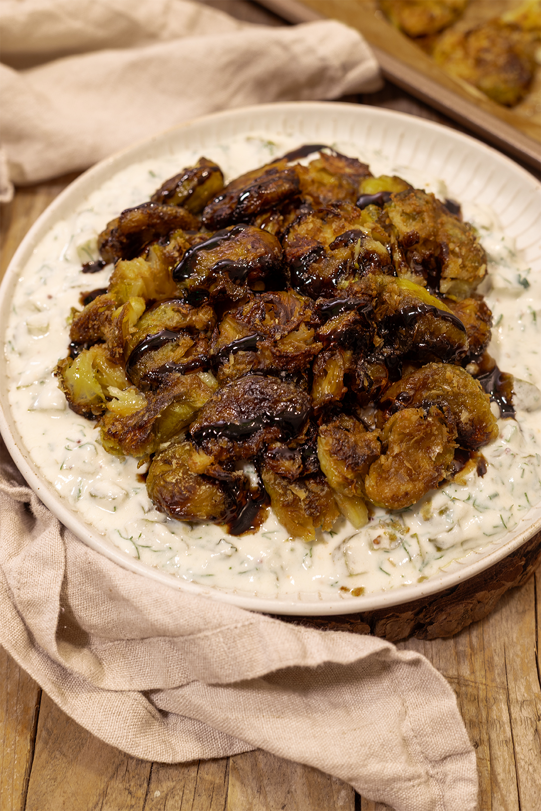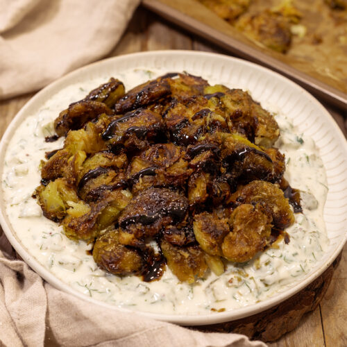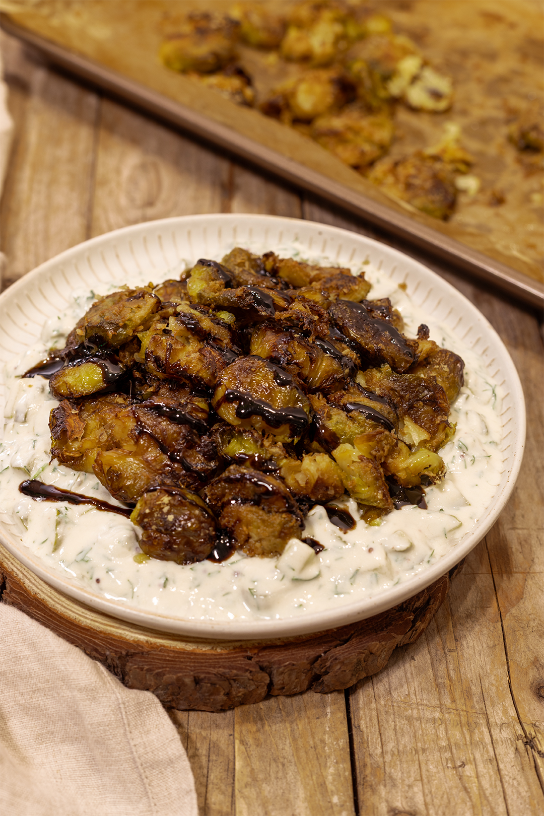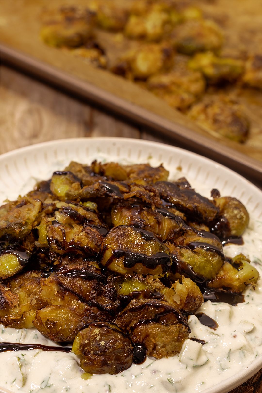 Die „Smashed“-Technik verwandelt gewöhnlichen Rosenkohl in knusprige kleine Köstlichkeiten. Durch das Plattdrücken nach dem Vorkochen entsteht beim Backen eine größere Oberfläche, die herrlich karamellisiert und kross wird – während das Innere schön zart bleibt. In Kombination mit würzigen Hefeflocken, cremigem Kräuterquark und einem Hauch Balsamico Crema wird daraus ein Gericht, das selbst Rosenkohl-Skeptiker überzeugt!