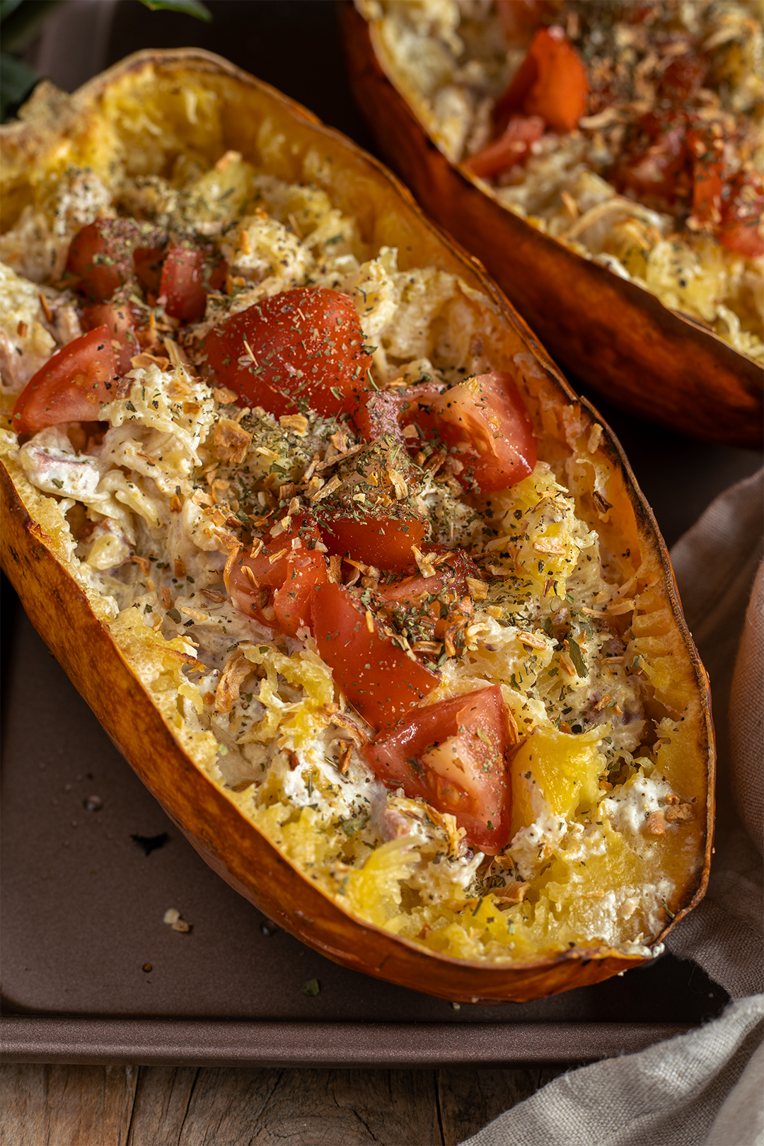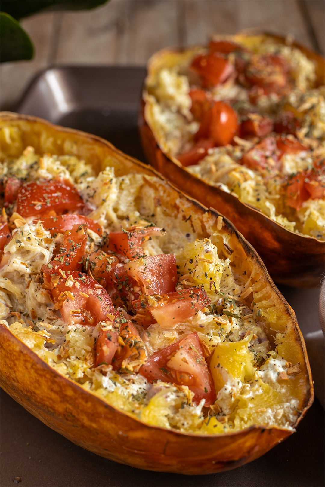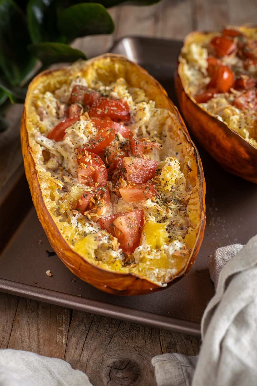 Heute zaubern wir uns einen herrlichen Spaghettikürbis mit einer wunderbar cremigen Sahnesauce und einer veganen Bacon-Alternative. Ein echter Kürbisklassiker hier bei uns.